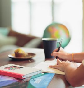 LearnOnline Exams - 16-18 year old sat at desk with writing on wall and books flying around